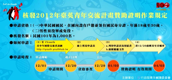 臺英青年交流計畫(Youth Mobility Scheme,簡稱YMS)自 2012 年1月1日起生效實施。